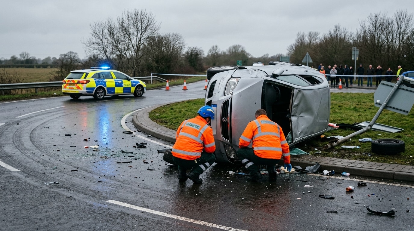 Un șofer de 52 de ani a pierdut controlul mașinii la intrarea într-un sens giratoriu în localitatea Sălcuța și s-a răsturnat pe DN 7, rănind trei persoane transportate la spital.