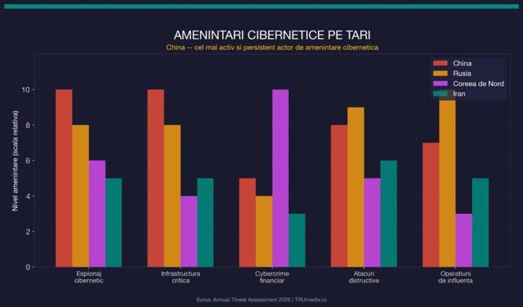 Cyber: China este descrisă drept cel mai activ și persistent actor de amenințare cibernetică la adresa rețelelor guvernamentale americane, a sectorului privat și a infrastructurii critice.