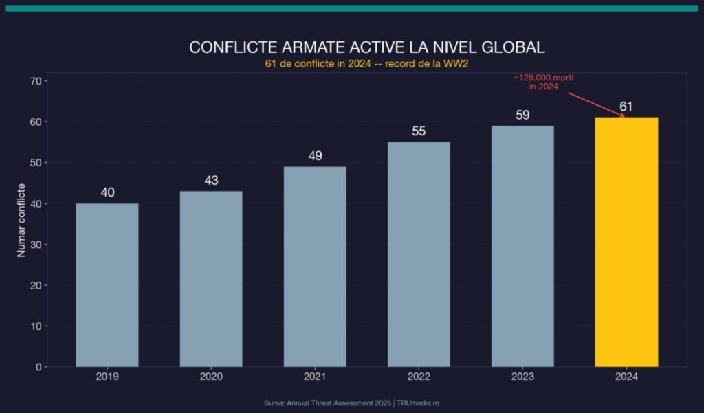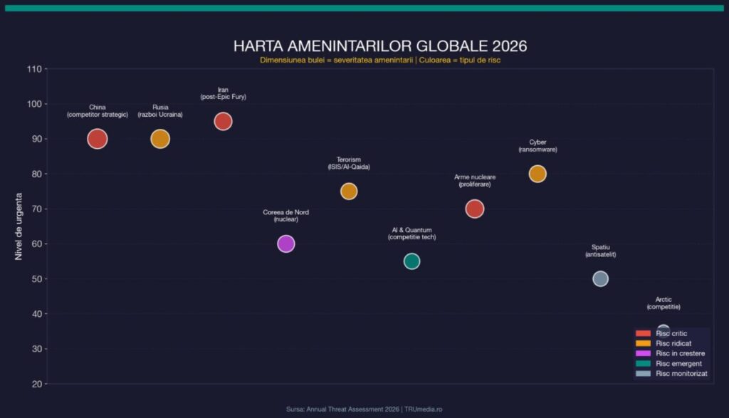 Comunitatea de Intelligence a Statelor Unite formată din 18 agenții și organizații guvernamentale americane care se ocupă cu colectarea și analiza informațiilor de securitate națională (intelligence), printre care și CIA, a publicat Evaluarea Anuală a Amenințărilor (ATA) pentru 2026, un document de 34 de pagini care oferă cea mai completă radiografie a riscurilor la adresa securității naționale americane. Raportul, clasificat ca neclasificat și semnat de Biroul Directorului Național de Intelligence, conturează un tablou geopolitic marcat de conflicte armate la cote istorice, competiție tehnologică fără precedent și un Orient Mijlociu redesenat de forță militară.