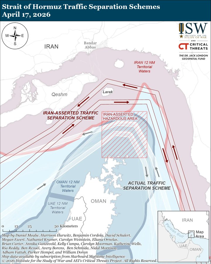 Harta ISW arată trei rute suprapuse: „Actual Traffic Separation Scheme” (ruta internațională clasică, prin exteriorul strâmtorii), „Iran-Asserted Traffic Separation Scheme” (ruta impusă unilateral de Iran prin apele sale teritoriale) și o „Iran-Asserted Hazardous Area” declarată periculoasă între insulele Qeshm și Larak. Navele comerciale au ales, în practică, o a patra soluție: tranzitează prin apele Omanului, ocolind complet ruta iraniană.