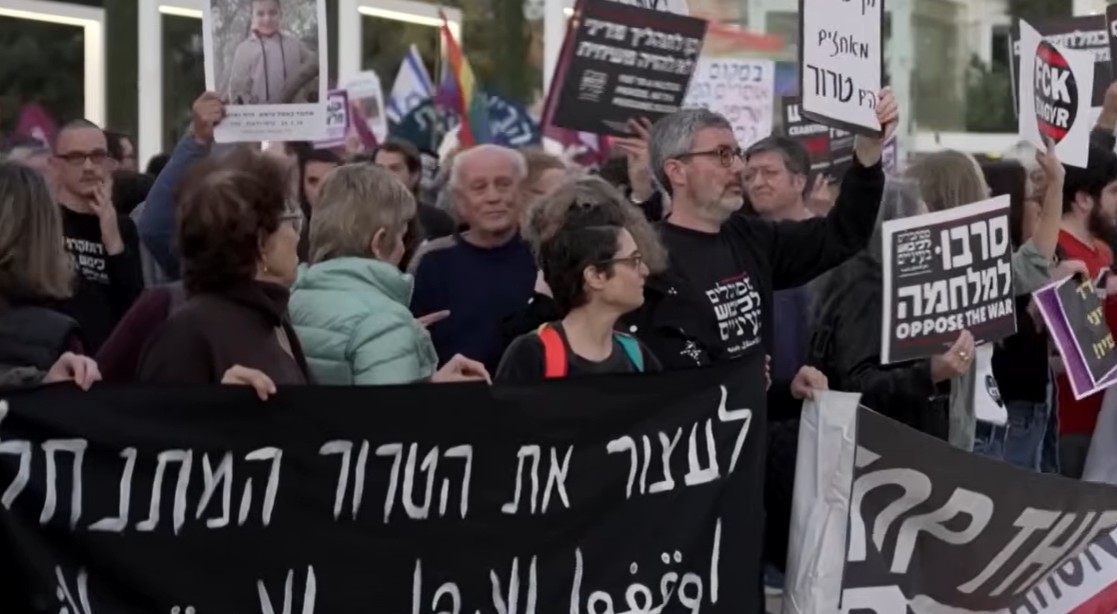 Manifestanții s-au strâns în piața din Tel Aviv, ținând pancarte pe care scria: „Nu bombardați – negociați! Puneți capăt războiului nesfârșit!” — în ciuda restricțiilor privind adunările publice impuse pe durata conflictului cu Iranul.
