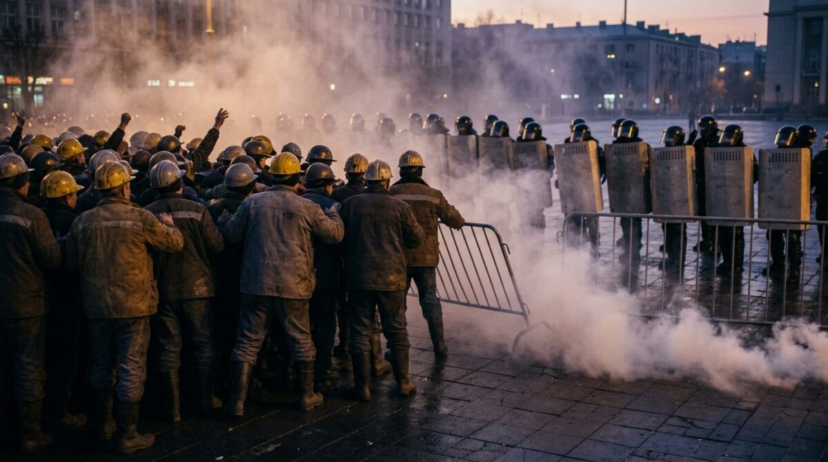 Jandarmeria Capitalei a folosit gaze lacrimogene în Piața Victoriei, marți, după ce protestatarii au forțat gardurile și au aruncat cu obiecte asupra forțelor de ordine — în spatele incidentelor se află 1.500 de concedieri anunțate la Complexul Energetic Oltenia.