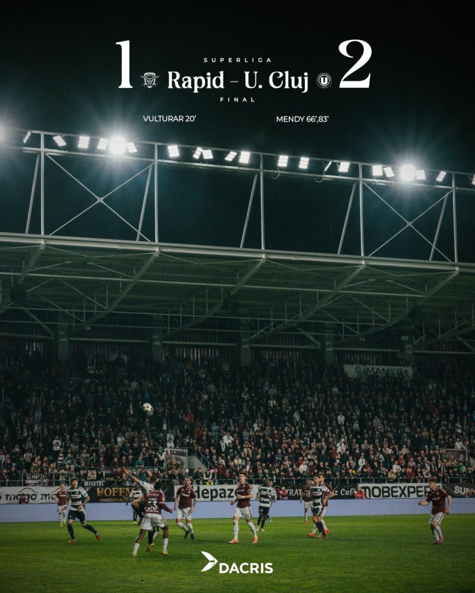 Giulești a fost, duminică seară, scena unui meci cu răsturnări de situație și emoții până în ultimul fluier. Rapid și U Cluj s-au înfruntat într-un derby cu miză uriașă în lupta pentru titlu, iar fanii prezenți în tribune au avut parte de tot ce înseamnă fotbal adevărat: un gol superb, parade decisive, o întoarcere de scor dramatică și o lecție de maturitate oferită de clujeni în repriza secundă. La final, cifrele au spus 2-1 pentru U Cluj — un rezultat care redesenează și mai clar ierarhia din fruntea clasamentului.